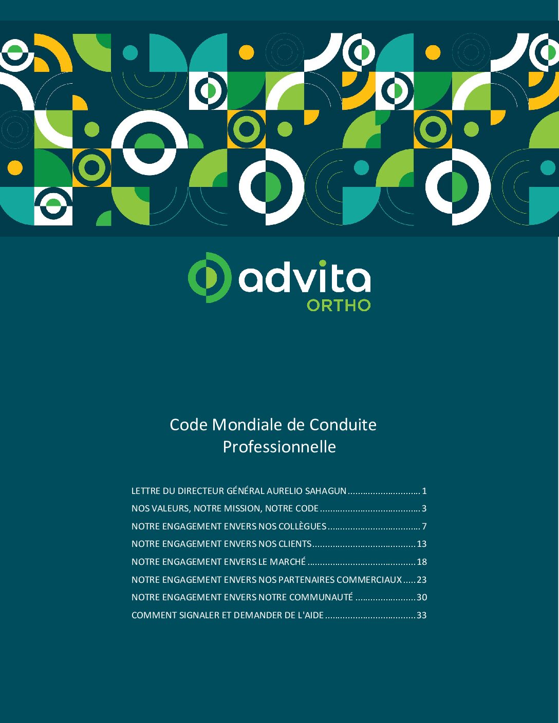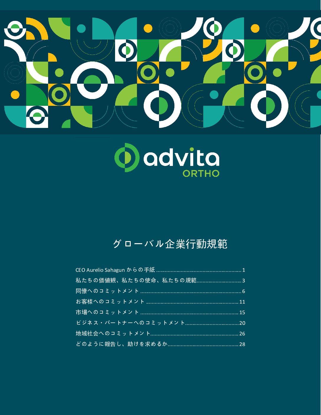 このグローバル行動規範および倫理規範は、当社のコアバリューを拡張したものであり、Advitaに代わって業務を遂行する際の指針となります。グローバル行動規範に加えて、当社のコンプライアンスおよび倫理計画は、この行動規範を実施し、当社のビジネスプロセスを管理するための詳細な方針および手順を提供します。毎年、すべての従業員が、グローバルコードで概説されている基準と責任を順守することへのコミットメントを証明しています。このグローバルコードは、英語を含むさまざまな言語で利用可能です。